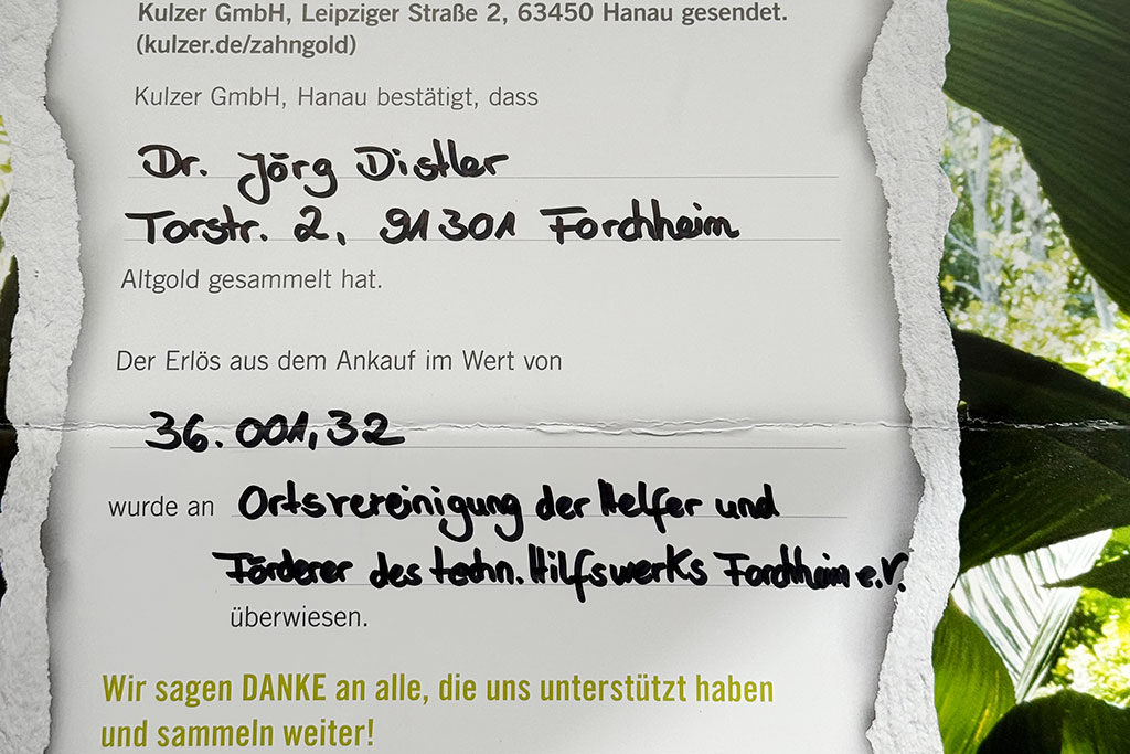 Wir unterstützen lokale soziale Projekte durch das Verwerten von Altgold. In der Praxis wird das Edelmetall desinfiziert und gesammelt. Unser zahntechnischer Partner "Die Zahnwerkstatt" des ZTM Stephan Dietzel in Forchheim unterstützt uns bei der Reinigung unentgeltlich. Die Scheideanstalt Fa. Kulzer aus Hanau trennt die verschiedenen Edelmetalle voneinander, verzichtet gegen eine Spendenquittung auf ihr Honorar und leitet die Gutschrift direkt an den Empfänger weiter. Somit können wir die kostbaren Rohstoffe ihrer Wiederverwertung zuführen und gleichzeitig die Spendensumme maximieren.